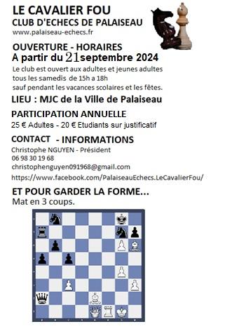 Je suis vraiment très heureux de vous annoncer la réouverture du Club d’échecs de Palaiseau, le mercredi 29 septembre et le samedi 2 octobre 2021 à la Cafétéria de la MJC de la ville de Palaiseau.